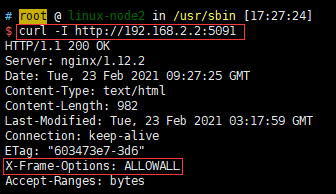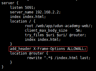 | sameorigin | 表示该页面可以在相同域名页面的 frame 中展示。 | add_header X-Frame-Options sameorigin; |