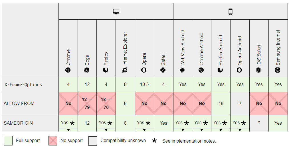 用于点击劫持的防御:现代浏览器遵循X-Frame-Options协议头(RFC 7034规范),根据协议头不同配置,从而决定一个资源是否允许加载到frame或者iframe中。
